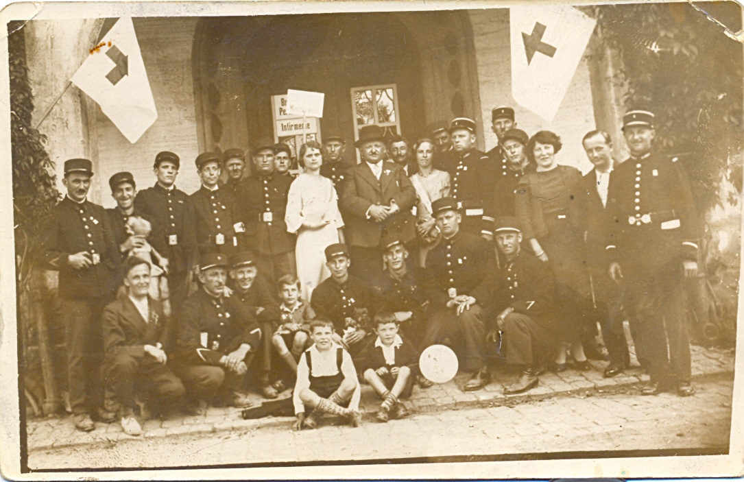 Les sapeurs-pompiers avec les infirmiers-brancardiers devant l’église.