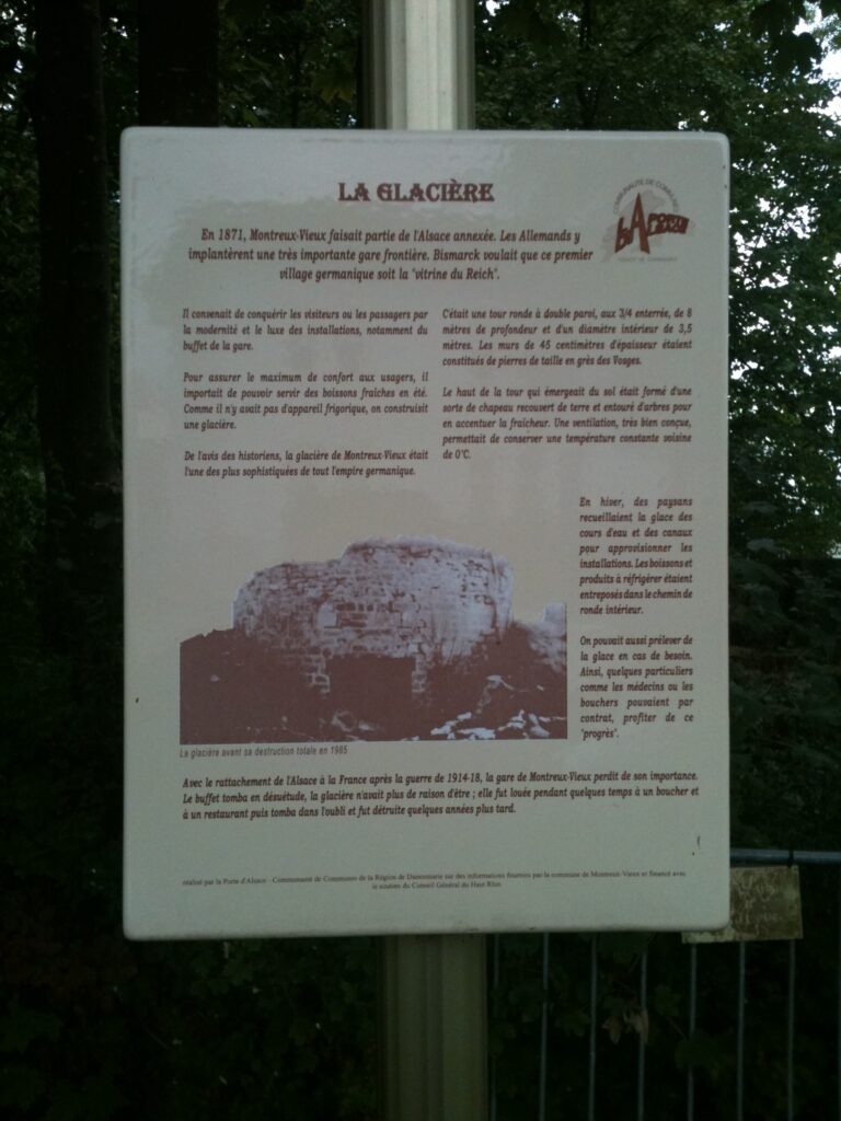 Avec le rattachement de l’Alsace à la France après la guerre 1914-1918, la gare de Montreux-Vieux perdit son importance. Le magnifique buffet tomba en désuétude, la glacière n’avait plus de raison d’être; elle fut encore louée un certain temps à un boucher et un restaurateur de la place puis tomba dans l’oubli. L’un des derniers à l’approvisionner fut M. Edmond Besançon, garde-champêtre et paysan à ses heures, qui la convoyait du canal avec son tombereau et son cheval. Dans le même temps d’ailleurs la fabrication industrielle de la glace, distribuée régulièrement par les brasseries, s’était vulgarisée, et avait rendu inutile cette installation.Pendant des années, elle devint un lieu de prédilection pour les enfants de la localité. Elle fut démolie en août 1985 par la SNCF.